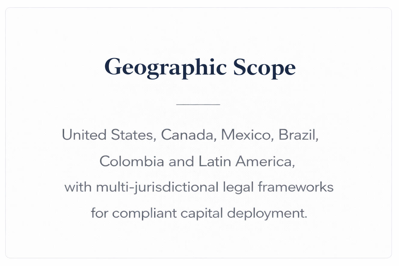 We build the legal, financial, and technological architecture through which global capital is structured, governed, and scaled..Operating across the United States and Latin America through regulated multi-jurisdictional structures, institutional fund vehicles, SPVs, Series platforms, and tokenized asset frameworks.